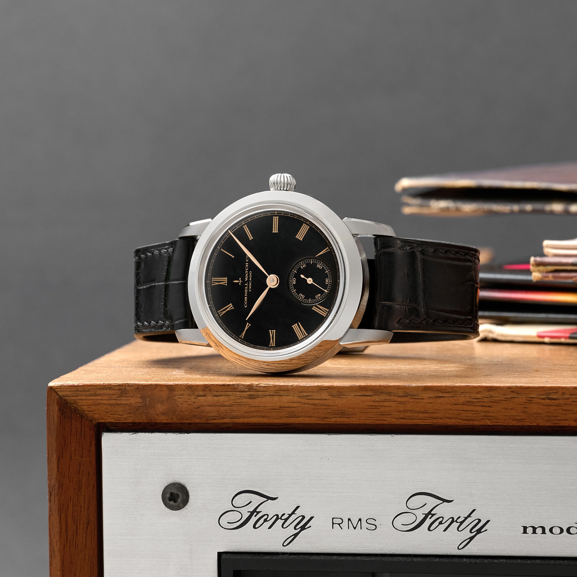 The 1870 CE (Classic Enamel) collection is constructed using the same timeless techniques – a traditionally crafted grand feu enamel dial, thermal blued hands and hand-finished movement decoration – as the original Cornell Watch Company railroad pocket watches of the 1870s, while offering the modern precision of a 33-jewel Schwarz Etienne ASE 200 automatic movement with a micro-rotor and 86-hour power reserve. This 39mm model is crafted from a mix of brushed and polished stainless steel and is hand assembled, rigorously tested and warrantied by the RGM Watch Company.